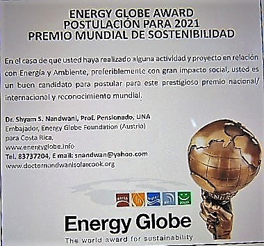 Los detalles y el formulario de solicitud están disponibles en http://www.energyglobe.info. Para cualquier pregunta, puede comunicar al contact@energyglobe.info o este servidor (Dr. Shyam S. Nandwani, Prof. Pensionado, Universidad Nacional, Heredia) por snandwan@yahoo.com. O (506) 83737204.